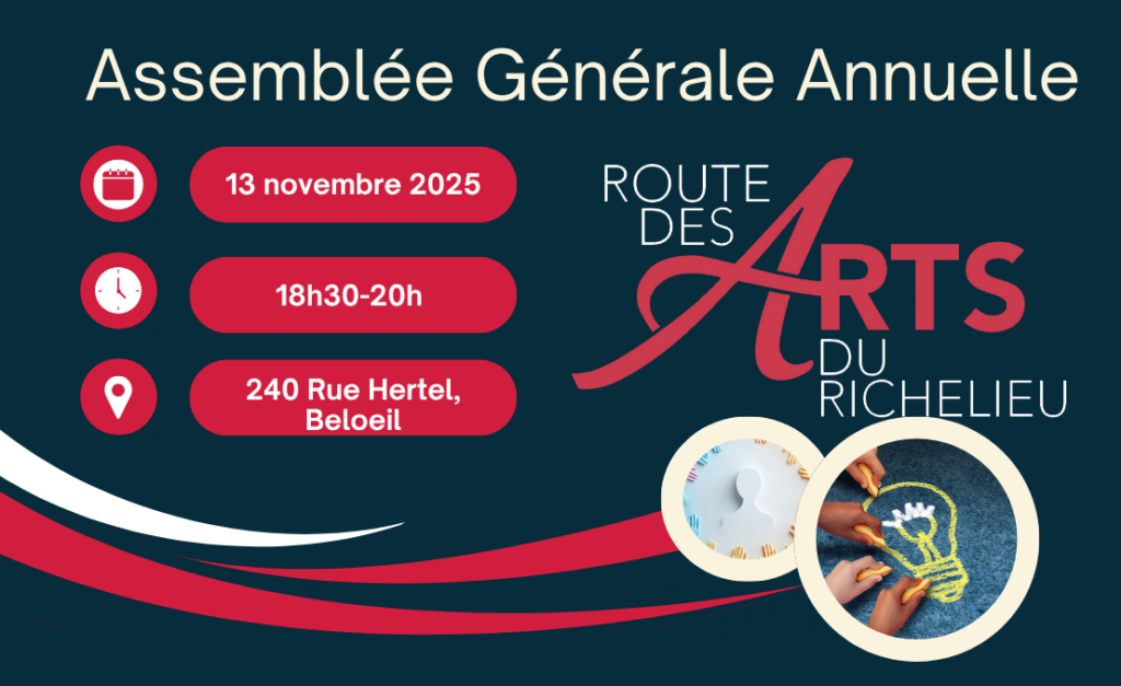 La Route des Arts du Richelieu invite ses membres, partenaires et amis à participer à son Assemblée générale annuelle, qui se tiendra le jeudi 13 novembre 2025, de 18 h 30 à 20 h, au Centre des loisirs de Beloeil.